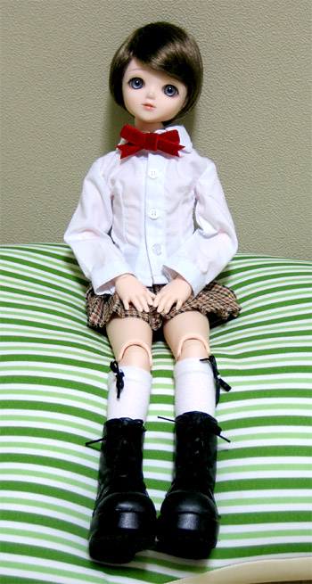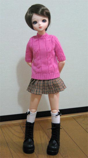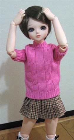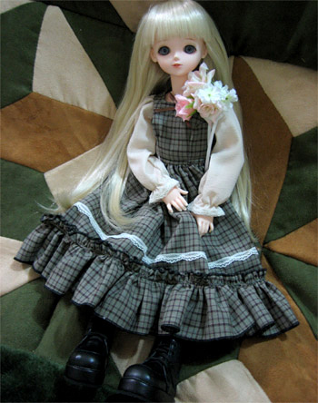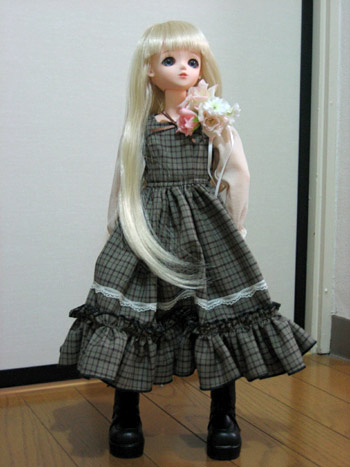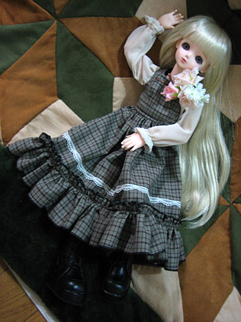 基本的に私はフリルだらけのヨーロッパ貴族調の服は苦手なので、ハルの服は今時の女の子風にしようと思っていたはずなのに、この服はナチュラルな色とカントリー調のデザインに惹かれて、うっかり熱くなって落札してしまいました。フリルは苦手なくせに、カントリー調には弱い私です。ああ、今月はお財布が痛いorz